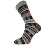 Made with a blend of wool, these soft grey socks have contrasting striped heel and toe and a Scandi pattern in black, blue and orange.
