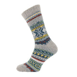 Soft and comfortable, these grey, green, blue, yellow and white patterned socks will keep you warm!