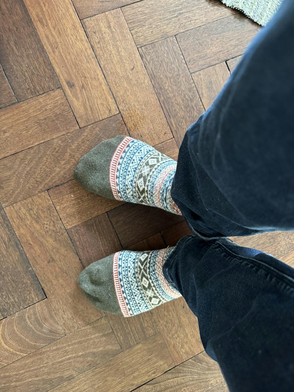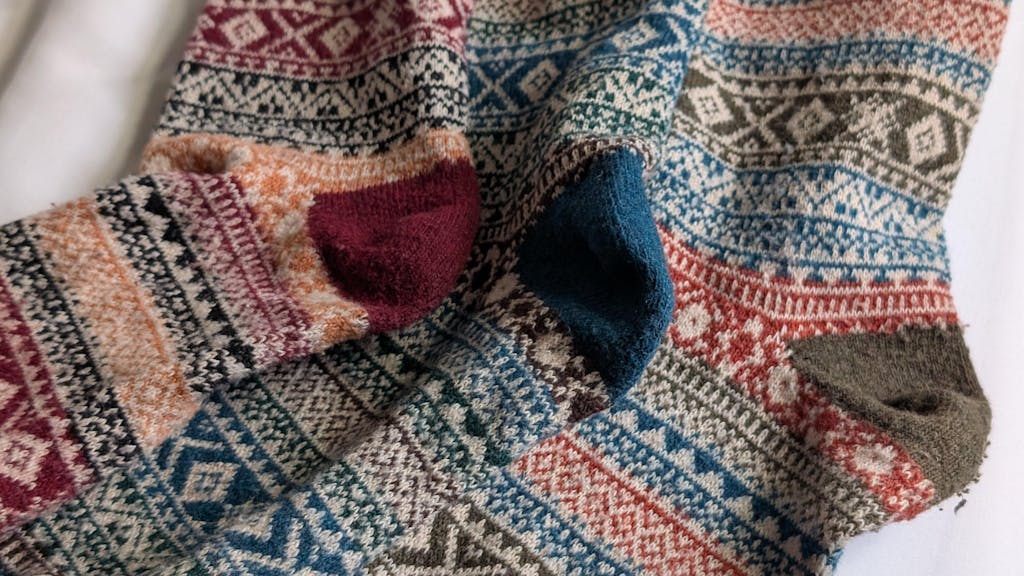 Dark red, green and blue Fairisle socks in a fine knit wool blend.