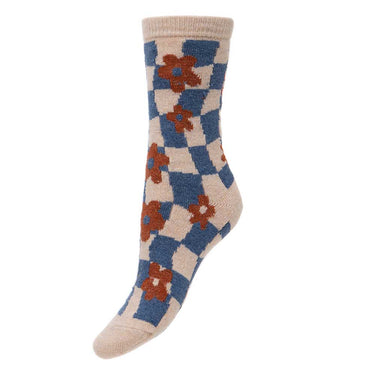 Blue and cream check wool blend socks with flowers