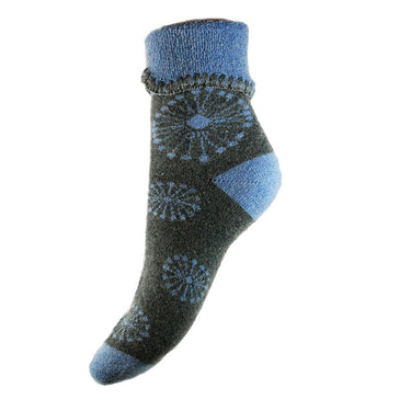 Cozy grey cuff socks with a beautiful blue flower seed design. Incredibly warm and snug, these socks are ideal for relaxing inside or adding a touch of flair beneath your boots. To maintain their quality, machine wash at 40 degrees and avoid tumble drying.