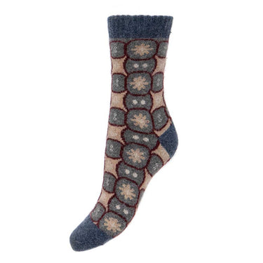 Fawn and dark grey wool blend socks with ribbed cuff and circle pattern