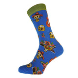 Bright blue Bamboo Socks with colourful Mexican skulls and guitars.