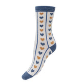 Experience the luxurious comfort of these cream-colored socks featuring blue lines, a contrasting heel, toe, and cuff, combined with pretty hearts.