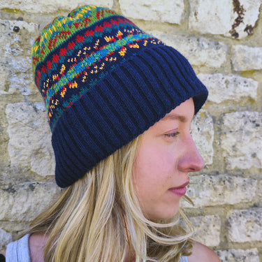 Snuggle in comfort in this dark blue fleece lined hat, featuring a bright Fairisle pattern of yellow, red and green.