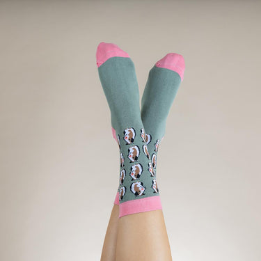 Grey bamboo socks, with a bright pink heel, toe, and cuff that will surely make a statement. Featuring adorable guinea pigs, these socks are a must-have for any animal lover.