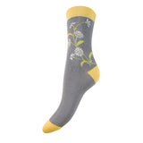 Grey socks with white flower sprig and contrasting yellow heel, cuff and toe