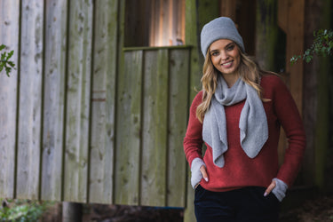 Enjoy a blissful feeling of warmth with this light grey fine knit scarf. Chevron-shaped edges and a fuller length make it extra luxuriously cozy!