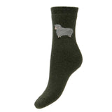Experience the luxurious feel of these dark green wool blend socks adorned with fluffy grey sheep!