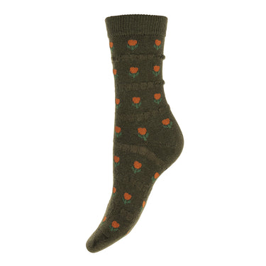 Dark green wool blend socks featuring vibrant orange tulips and a subtle ruched stripe. Elevate your sock game and add a pop of colour to any outfit.