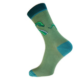 Green Bamboo Socks with Sea Serpent and contrasting blue heel, toe and cuff