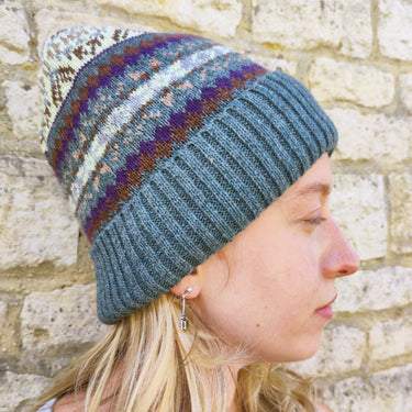 Cozy up in this luxe sage green fleece lined hat, complete with a delightful Fairisle pattern of purple and cream tones.