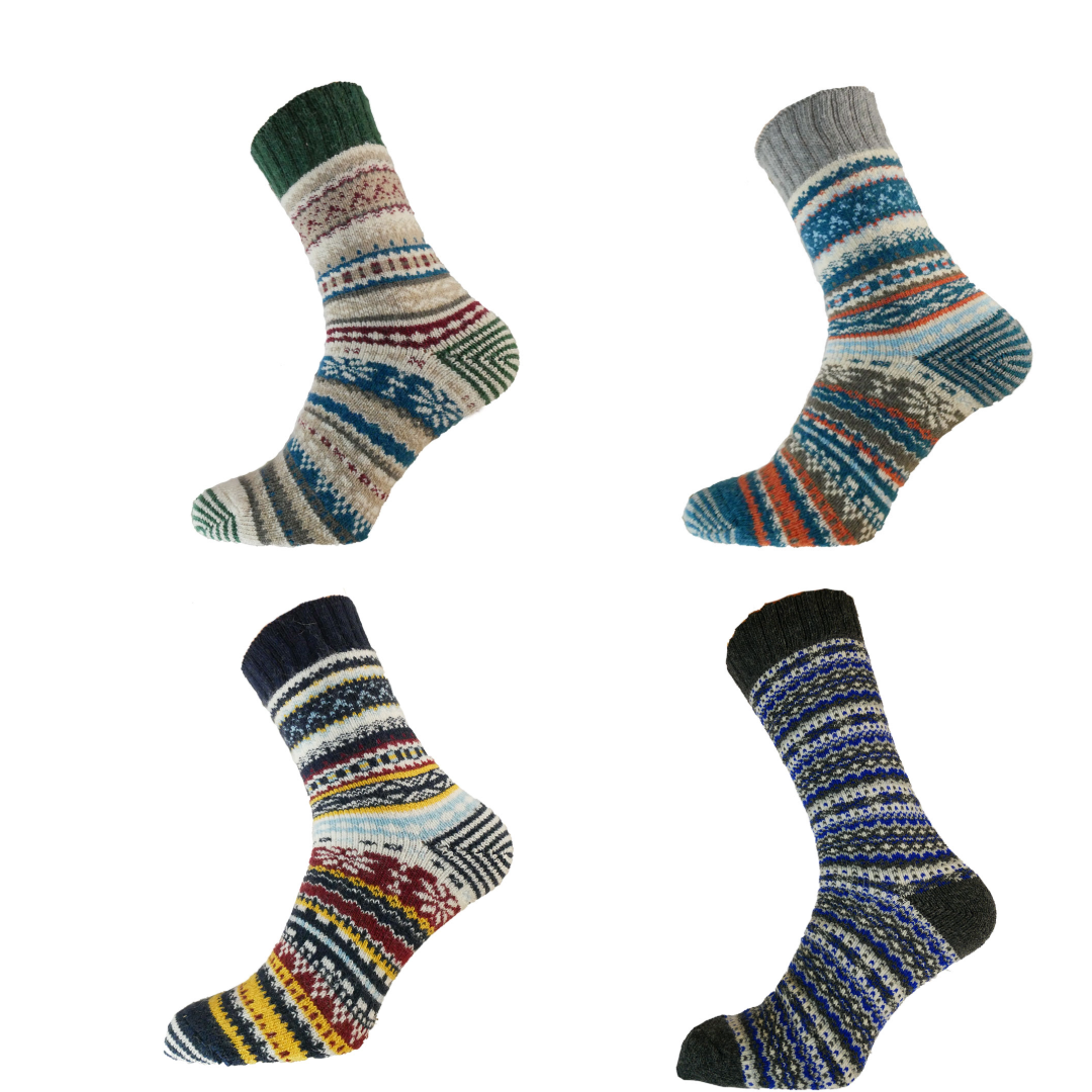 4 pairs of assorted blues and brown Scandi patterned wool socks. Soft, warm and very comfortable and designed to stay up!